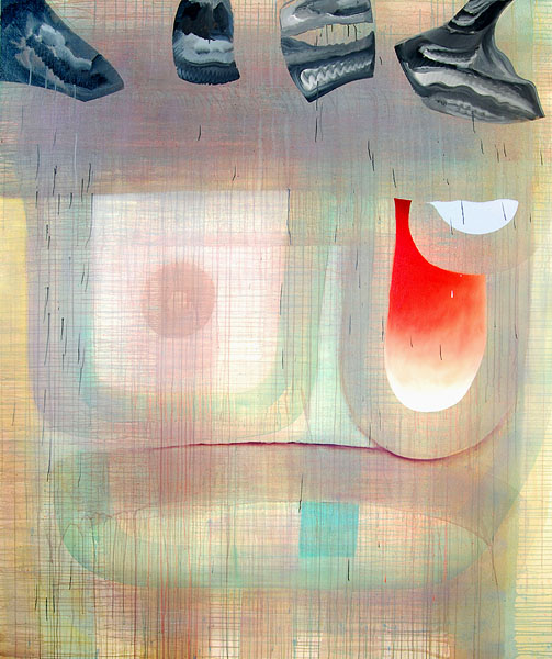 After having established a background of washes in acrylic, which created a dynamically drab landscape of deep space, I countered the low tone and wide-open organic field with linear forms in brilliant oil paint. These linear elements, nicknamed Tuning Forks, are actually two figures having formed their own gravitational equilibrium. They are provisional portraiture, where likeness is a nether quality and earnest seeming (potential) is everything.
